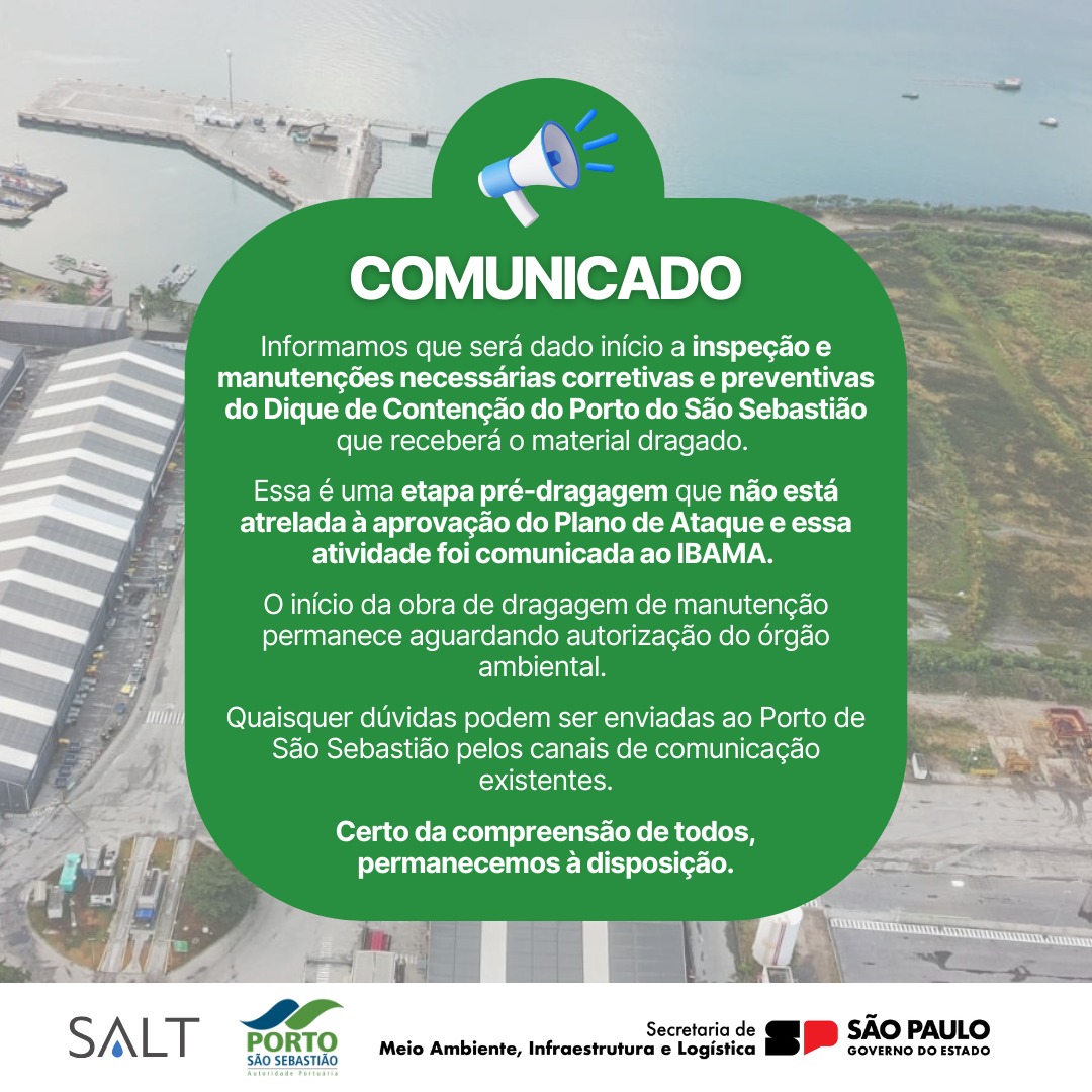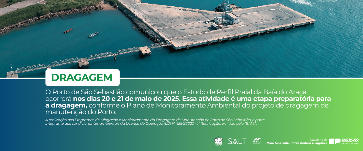 Após as anuências iniciais do Ibama com o Plano Conceitual de Dragagem de Manutenção, a Companhia Docas de São Sebastião contratou empresa especializada para realizar a dragagem de manutenção do berço principal de atracação. A quantidade estimada de dragagem é de aproximadamente 35.000 m³.